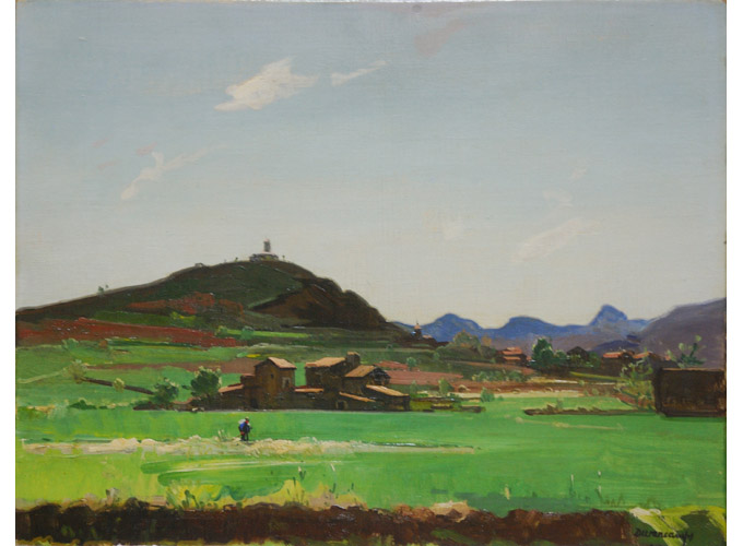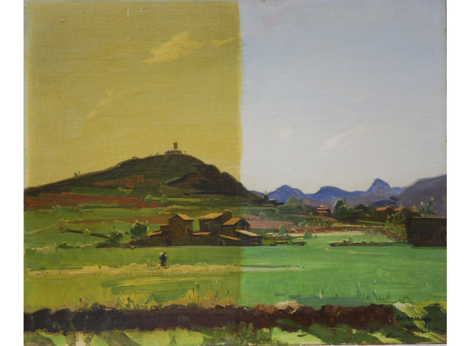 En esta obra sobre cartón el barniz oxidado y la capa de suciedad superficial acumuladas nos impedían apreciar la nitidez del cielo y la profundidad del paisaje.
